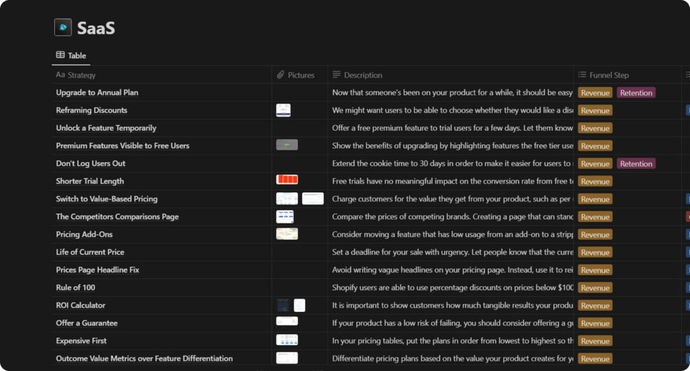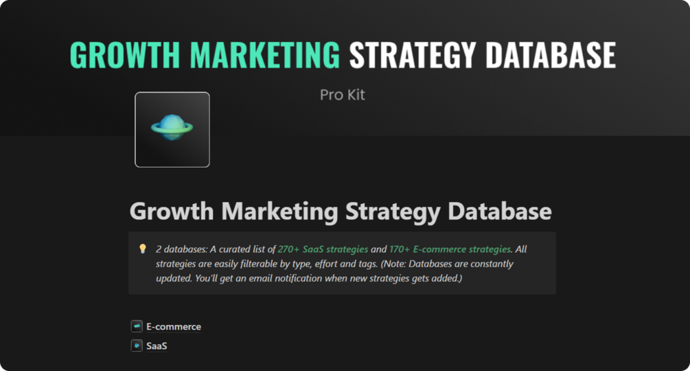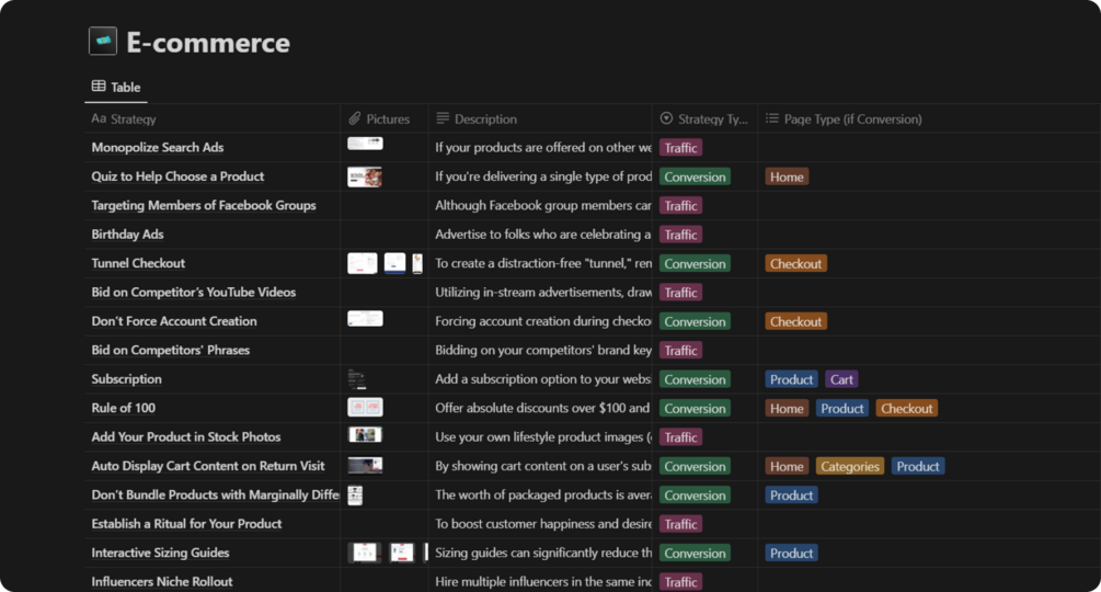 450+ strategies used by the highest converting, fastest-growing stores on the Internet and hyper-growth E-commerce & SaaS startups. Never run out of tactic ideas again. 🚀